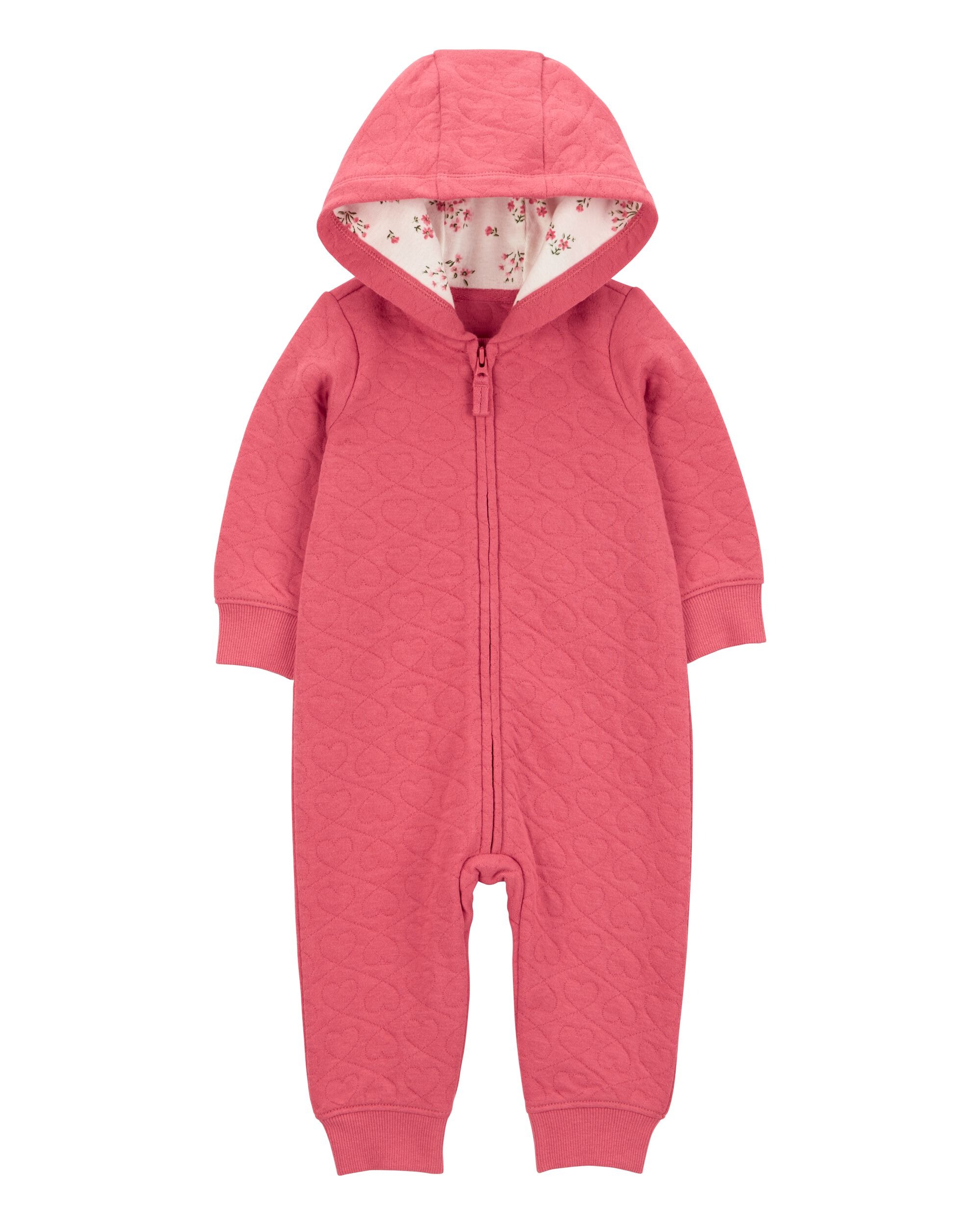 Macacão em moletinho com capuz em algodão liso com estampa de coração para bebê.