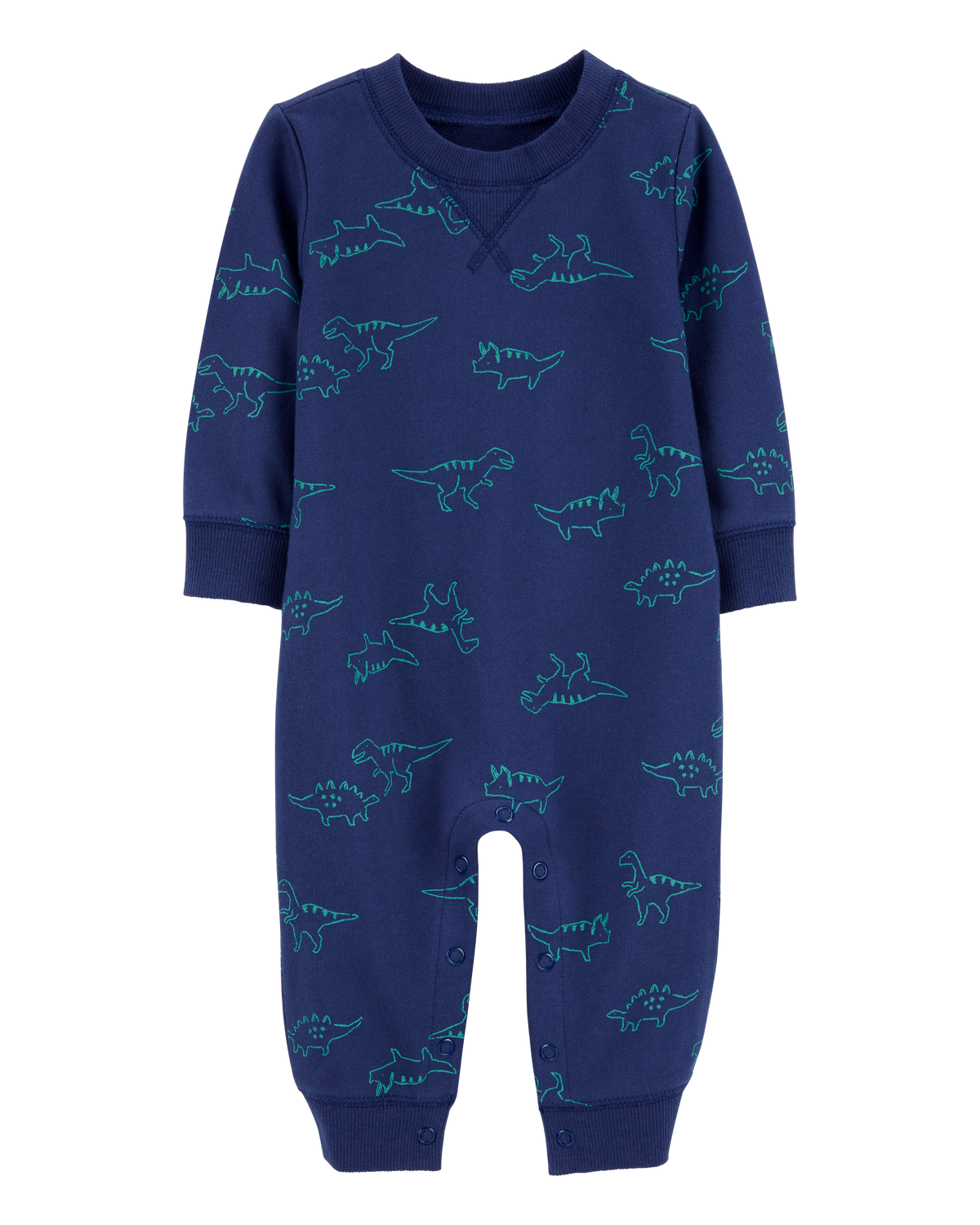 Macacão sem pezinho, cor predominante azul, com linda estampa de dinossauro. Tecido moletinho, confortável para o seu bebê.